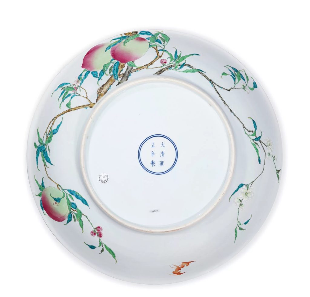 - 2024 年澳门多禄溙春拍:一件直徑 50.5 厘米的清雍正粉彩過枝「福壽雙全」八桃五蝠大盤,從 2000 萬元起拍,最終以 3800 萬元落槌,加佣金以 4255 萬元成交。