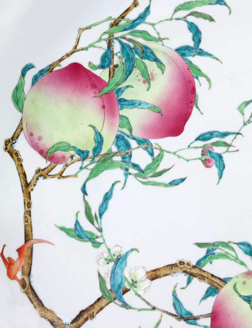 - 工藝技法:採用了「過枝」技法,即花繪佈局將碗盤內和外壁相連通,圖案自盤外壁攀延過盤邊伸展鋪陳於盤心,使內外圖案既獨立成章又渾然一體,這需要工匠具備高超的繪畫技巧和對整體佈局的精準把握能力。同時,雍正粉彩以細膩淡雅著稱,此盤運用多種彩料,桃實的粉紅色彩從淺粉到深紅柔和過渡,層次分明,葉片透過深淺不一的綠色調展現出陰陽向背,極富立體感。