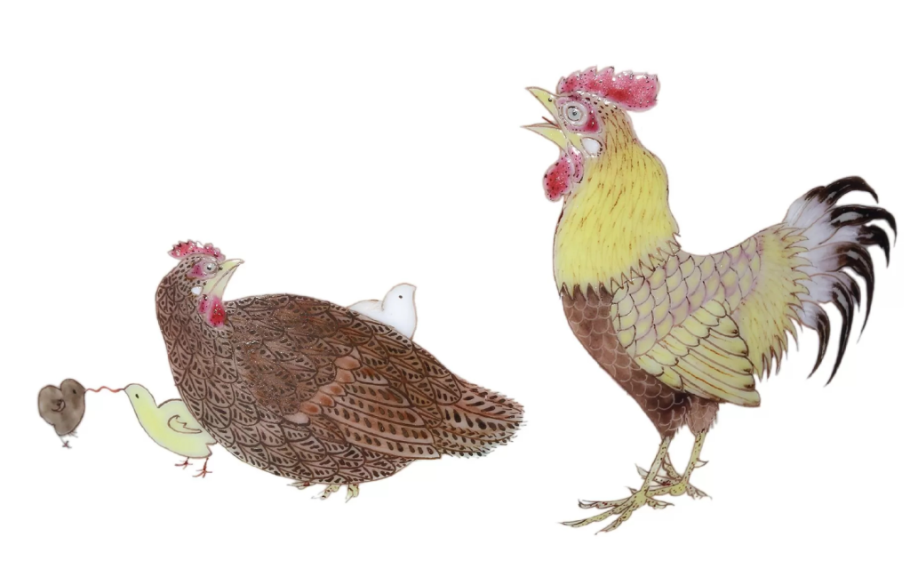 - 紋飾特點:杯外以粉彩绘子母雞圖。其中一杯繪公雞佇立張喙,色彩斑斕鮮明,旁有母雞率三隻幼雛於野地覓食,幼雞啄蟲,母雞羽翅呈棕褐色,回首凝視公雞,背面另點綴小蟲;另一杯主題相近,繪公雞為幼雛捕獲小蟲,母雞羽翼雪白,隨伴其側。此對杯施彩精絕,雞羽等細節筆觸細膩,頗具畫琺瑯之韻,生動傳神。