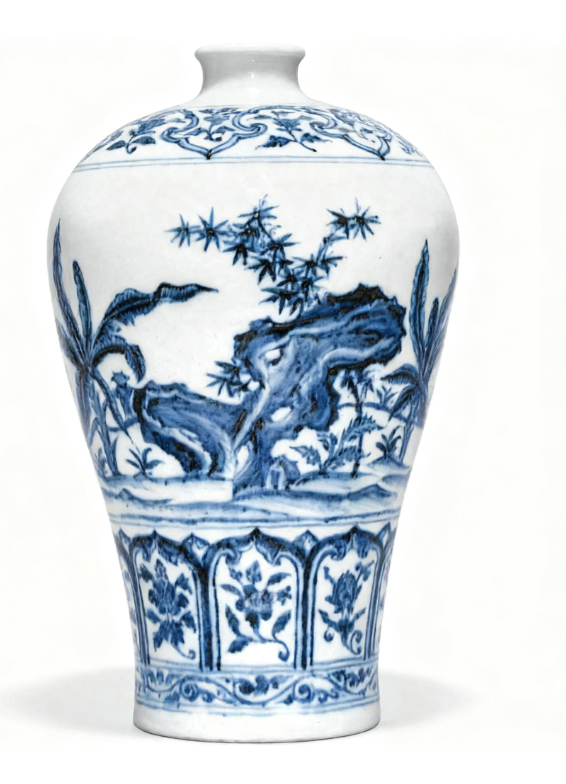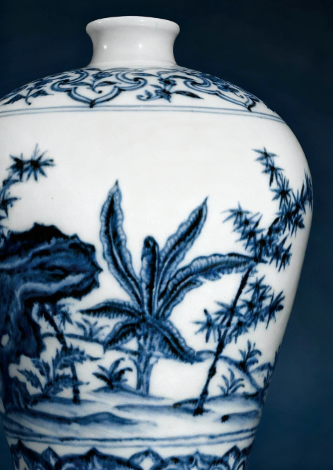 明永乐时期精美稀有的青花竹石芭蕉纹梅瓶,是永乐官窑青花瓷的典型代表。