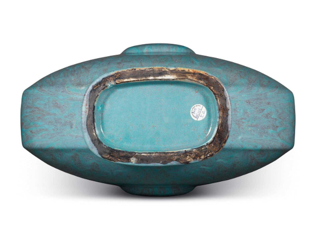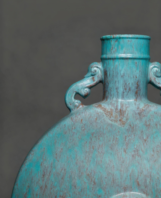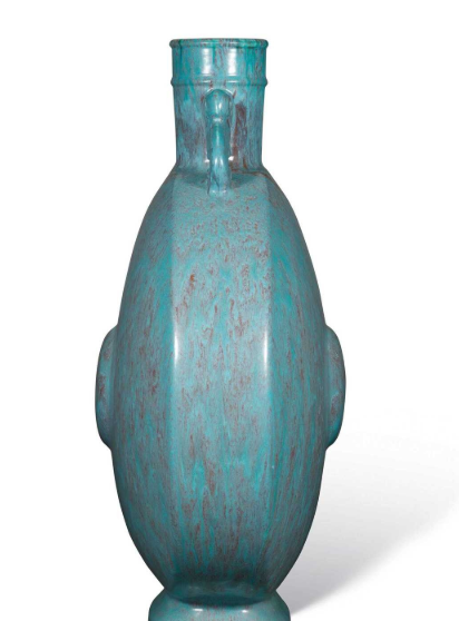清雍正爐鈞釉雙耳扁壺造型古朴,釉色素雅,兼具了青銅器的古樸之美與爐鈞釉的流動斑斕之妙,是雍正朝瓷器中的精品。其工藝複雜,成品率低,存世量相對稀少,因而在藝術品拍賣市場上備受關注。