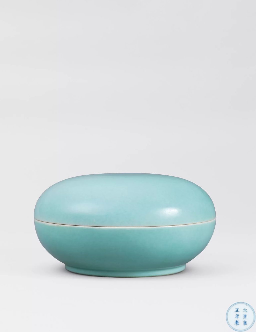 - 稀缺性:雍正御窑瓷质捧盒存世较少,单色釉作品更是少之又少。此式捧盒除松石绿釉外,仅见故宫博物院藏有白釉品种,尺寸略小,而相同釉色的盖盒,目前仅见伦敦大维德基金会藏有一例,尺寸较小,属印盒、香盒之类。该捧盒原为瑞士著名收藏家玫茵堂旧藏,来源显赫。