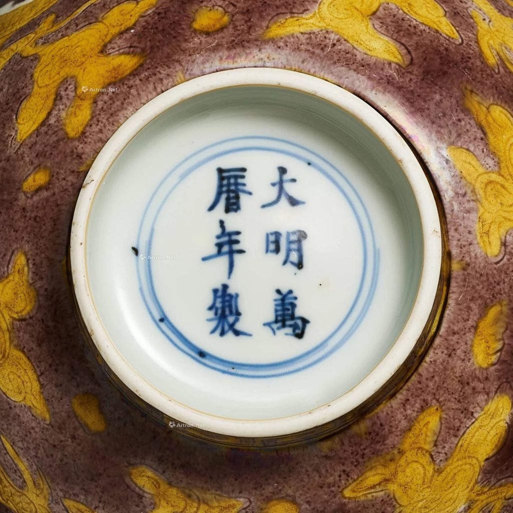 - 2021 年 12 月 29 日澳门多禄溙:一件直徑 15cm 的明萬曆茄皮紫地黃彩暗花雲龍紋盌,成交價為 4,600,000 港元。