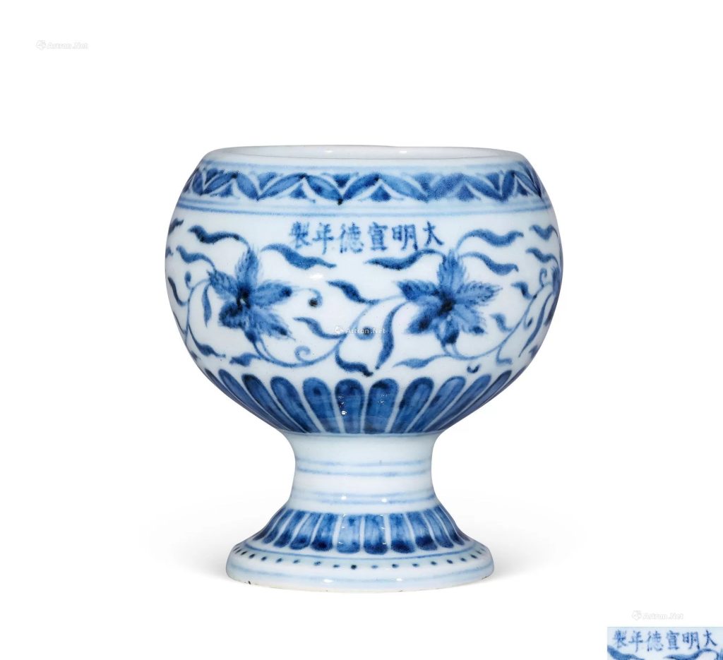 - 澳门多禄溙拍賣:2022 年拍出一件明宣德青花纏枝花卉紋豆,尺寸為 10.3 厘米高,款識為「大明宣德年製」六字楷書橫款,估價 500,000-800,000 元,最終成交價為 1,652,000 港元。
