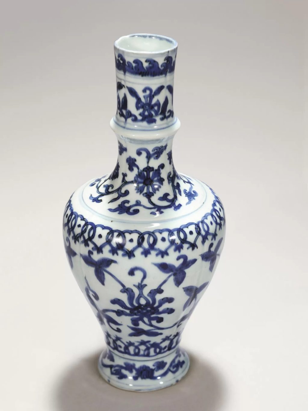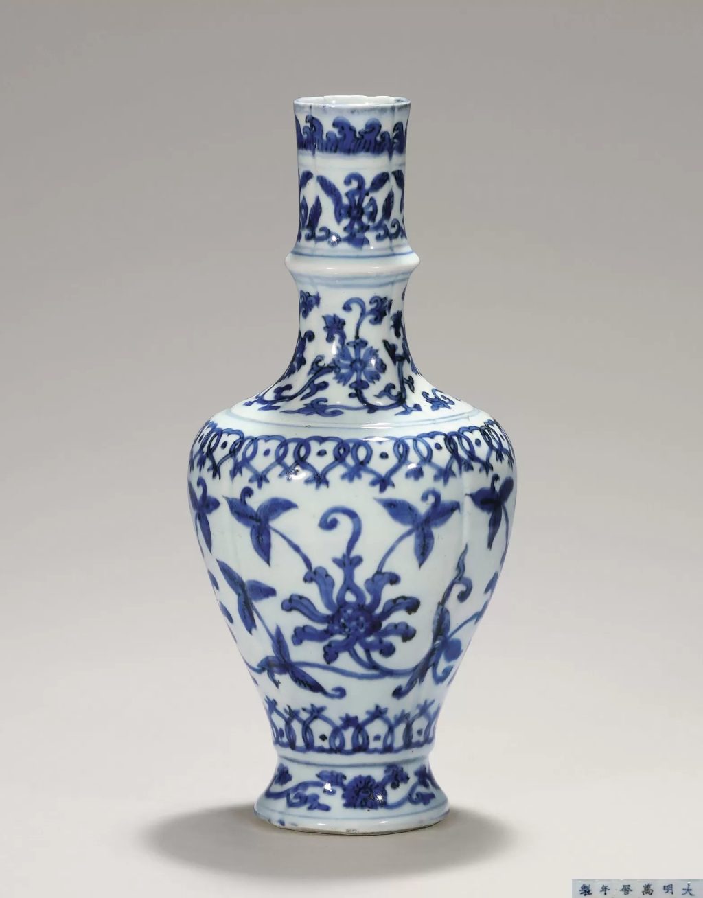 - 造型:瓶呈四瓣瓜棱形,頸部一周隆起竹節狀裝飾,俊秀挺拔。這種造型承襲了成化時期的風格,但又略有變化。
