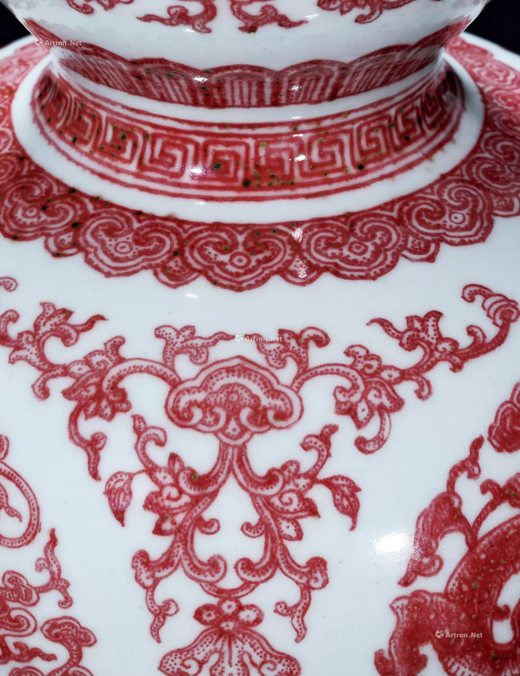 - 工藝:釉裡紅創燒於元代,其製作工藝繁雜而苛刻,講究物理變化之妙,故明永宣後少有成器者。直至康熙一朝,釉裡紅呈色漸趨穩定,到乾隆時期達到爐火純青的地步,此時的釉裡紅發色較為純正豔美,此瓶釉面肥潤,釉裡紅發色典雅,紋飾筆觸纖細,堪稱乾隆時釉裡紅品種的經典之作。