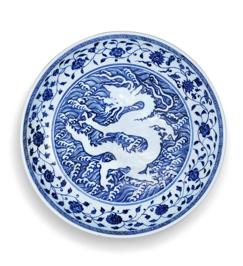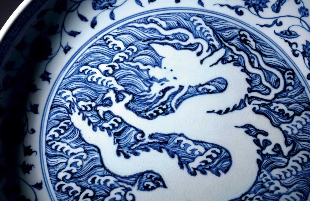 - 纹饰:通体以青花描绘纹饰,内壁绘有牵连缠绕的缠枝花卉十二朵;外壁绘奔龙四条,其间以壬字云纹间隔。盘心处的青花双圈内绘奔涌的海涛为地,再以留白技法浅刻须爪鳞片表现一半侧面立龙,仅双目龙睛以青花点绘,身旁围绕的火焰亦以留白技法表现,在青花海水地子的波涛衬托下,龙跃于渊,极具神韵。