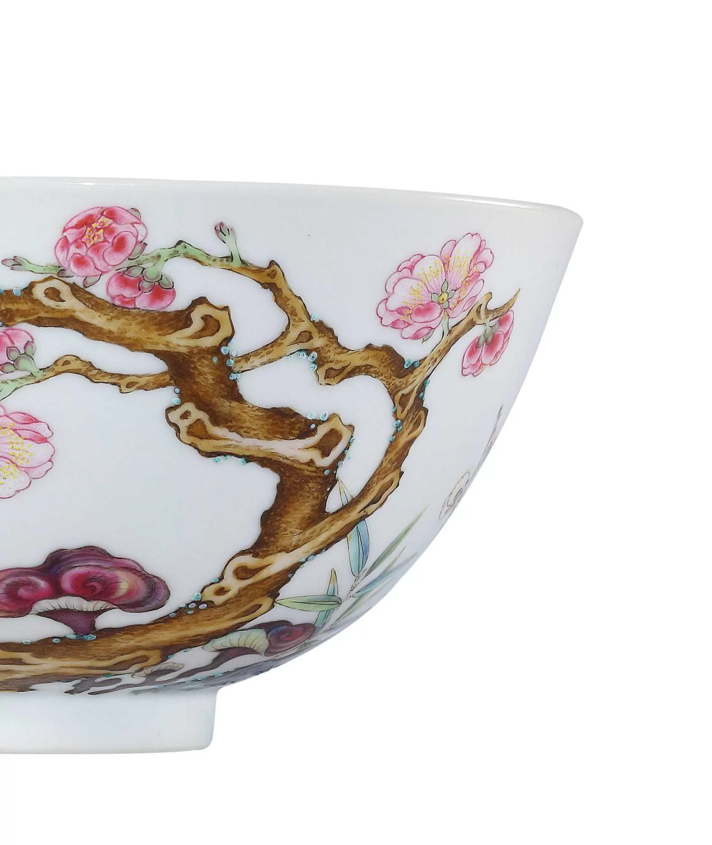 - 紋飾:碗身以粉彩及琺瑯彩繪就,外壁繪有兩樹寒梅,一紅一白,橫欹生姿,枝頭吐萼含苞,風姿綽約。梅花為五瓣雙層,紅梅萼片以淡粉彩敷染,花瓣略染胭脂紅,白梅萼片以綠彩敷染,花瓣填繪玻璃白彩,對比鮮明。梅樹主幹間隙中,以洋彩技法繪就兩顆靈芝,寓意祝壽,再輔以仙竹為伴,展現出豐韻傲骨。