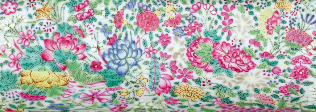- 紋飾特點:外壁滿繪四時百花圖案,在中心位置繪有大朵的牡丹、荷花,周圍簇擁小朵的玉蘭、繡球、蘭蕙、石榴、芙蓉、菊花、桂花、菖蒲、石竹等四季花卉,花葉滿密覆蓋全器,形成「百花不露地」的效果,寓意百花獻瑞,盛世長春。