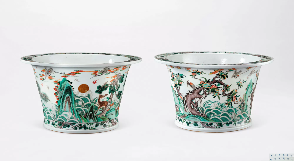 - 工藝特色:此花盆屬典型的戶外花盆,器型碩大恢弘,風格深沉靜穆,製作極為講究,充分體現康熙五彩的高超工藝水平。其綠彩鮮澈透明,在潔白釉面的映襯下蔥翠欲滴;礬紅紋飾顆粒飽滿且富有質感,於濃妍華麗中顯現端莊穩重之氣,是康熙朝礬紅彩所獨有的特徵。