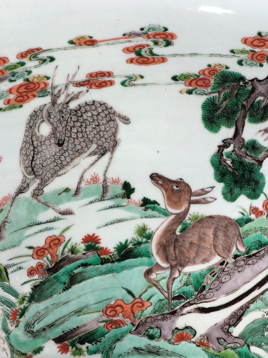 - 紋飾圖案:盆身外壁以五彩繪鶴鹿同春紋,實際運用紅、黃、黑、深綠、淺綠、碧綠、翠藍、茄紫共八種色料。主圖中,松樹前的瑞鹿回首仰視,與飛翔於天空的兩隻仙鶴相互呼應;松樹枝葉婆娑、虬枝蜿蜒,地面上疊石錯立,翠竹相互掩映。整幅畫面構圖飽滿,繪畫精緻細膩,以黑彩勾勒輪廓,線條挺拔有力;亂石嶙峋,以各式綠彩設色,色階豐富,立體感極強。