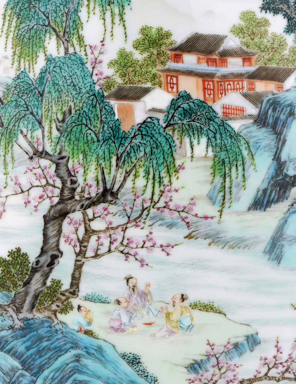 - 畫面內容:若以手卷論,圖畫伊始處有巍峨巨石呈拱門狀立於潺潺江水之中,碼頭上空無一人一物,似點明此處為遺世之境。稍稍轉動瓶身,桃源之景映入眼簾,岸上人物衣袖色澤鮮艷,立於桃花綠柳及松柏之間,或遊船、或對飲、或遙指遠處亭台樓閣品評湖光山色,遠處的重巒疊嶂與茫茫青翠之中,間或有小屋藏於其中,展現出「土地平曠,屋舍儼然,有良田美池桑竹之屬」的祥和之景。