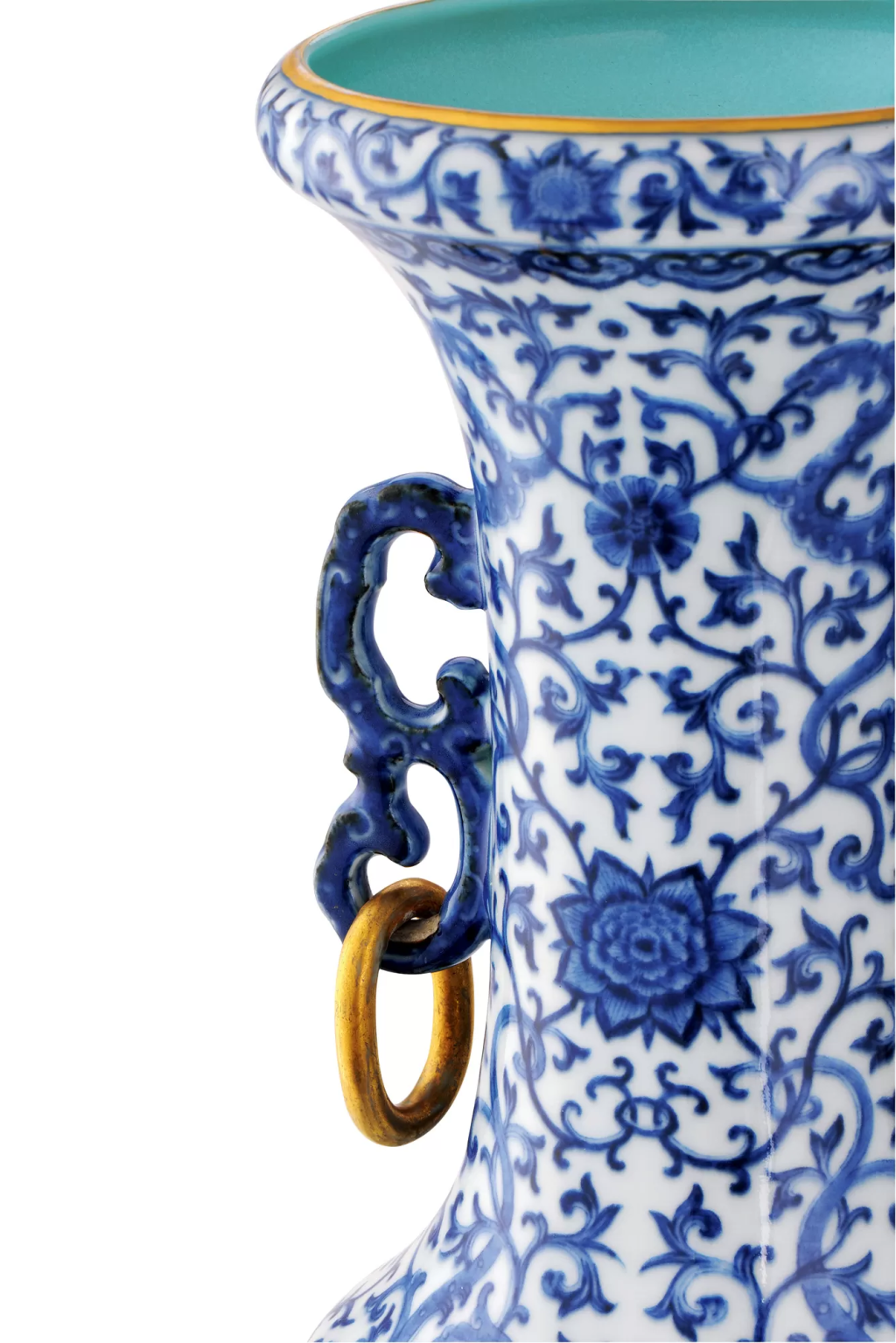 - 裝飾工藝:瓶頸足均以青花裝飾,上繪纏枝花卉間以螭龍紋,下呈如意雲頭紋與蓮瓣紋,畫工細膩,發色深淺有度。頸上一對螭龍耳各墜一原配金彩活環,保存完好。器身以彩料細繪「桃花源」通景圖,運用西方繪畫技法,江水以極淺淡的灰藍色料點染,水中巨石以披麻皴與斧劈皴繪製,上方以藍彩抹上靄靄雲氣,使畫面具有強烈的立體感。瓶口沿及耳上活環施金彩,口內與足底均施松石綠釉,底書「大清乾隆年製」六字三行礬紅篆書款。