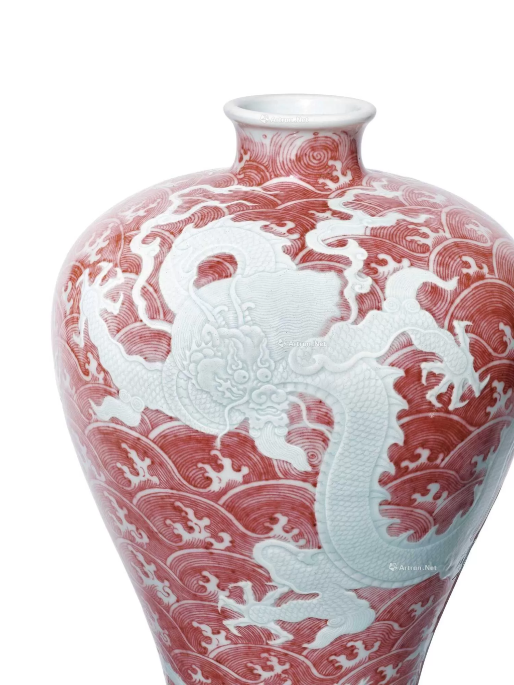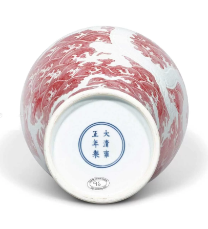 - 裝飾工藝:採用了釉裡紅與錐拱相結合的技法。釉裡紅是以銅為著色劑,在高溫還原氣氛中燒製而成的釉下彩裝飾工藝,燒製難度極高。雍正時期的工匠成功掌握了這一複雜工藝,使梅瓶上的釉裡紅發色純正、鮮豔。瓶身的波濤紋以釉裡紅繪製,採用「線描」技術,紅色線條勾勒極其細膩。同時,以錐拱技法在胎體上用尖銳工具刻劃出蒼龍紋飾,再施釉燒製,圖案微微凸起,富有立體感。龍身的鱗片、眼睛、鬚髯等細節皆無邊線勾勒輪廓,以浮雕暗刻而成,細膩地渲染出巨龍的崢嶸神態。