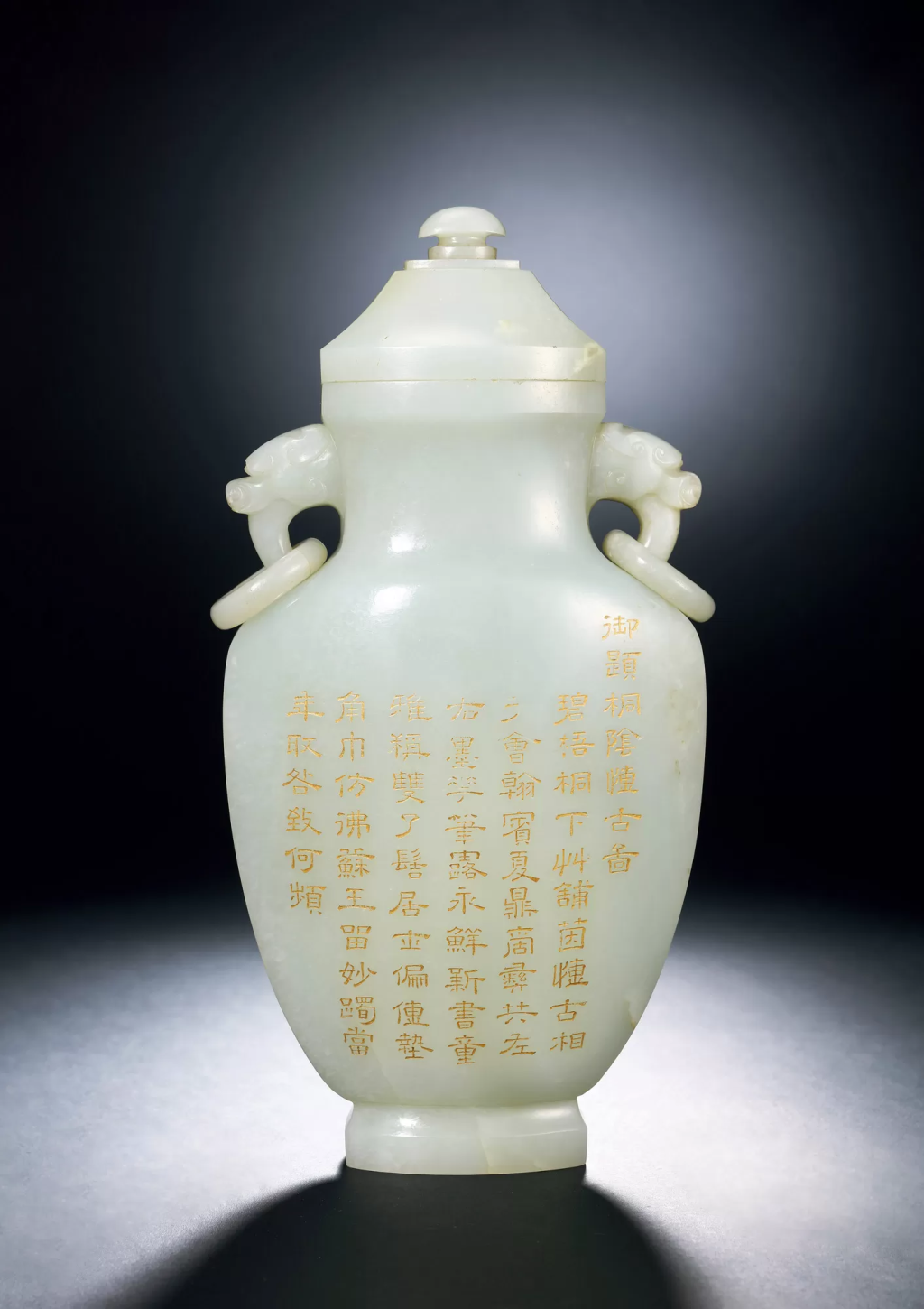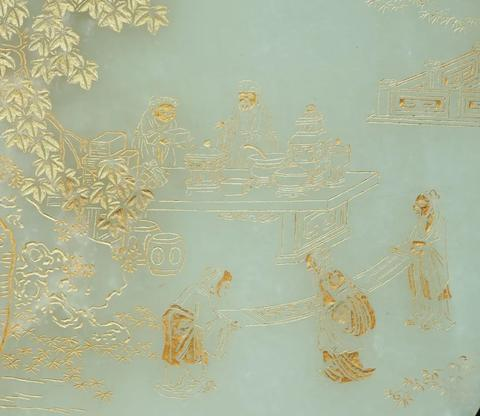 - 紋飾:瓶身正面取宮廷收藏的崔子忠《桐蔭博古圖》畫意,鐫刻文人士大夫在梧桐樹下鑑賞古玩的場景,人物意態生動,樹石佈景亦皆得法神妙。背面刻乾隆御製詩《崔子忠桐蔭博古圖》,字跡結體端正,氣韻貫通。圖文皆塗金,與玉質交相輝映,更添光彩。
