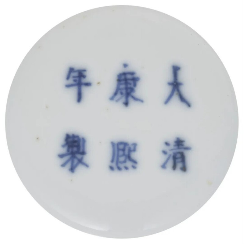 尊撇口,細長頸,豐肩,長腹,窄圈足。頸下部凸起弦紋三道,凸起處釉層較薄,透出白色胎骨。圈足內施白釉,外底署青花楷書「大清康熙年製」六字三行款。