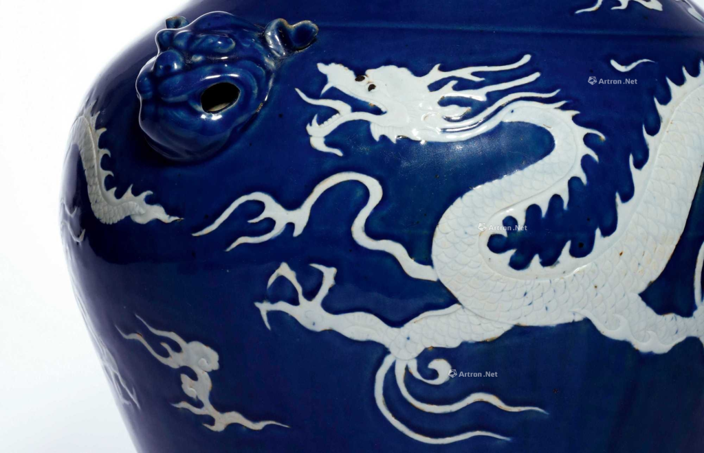 - 釉色工藝:通體施珍稀進口蘇麻尼青霽藍釉,留白龍的工藝為鏟地白瓷塑,是在將乾的胎體上鏟出龍的造型,再用白瓷泥填滿,未干透之前刻劃龍鱗,使之栩栩如生。釉面可見橘皮紋,雲龍、寶珠施青白釉。