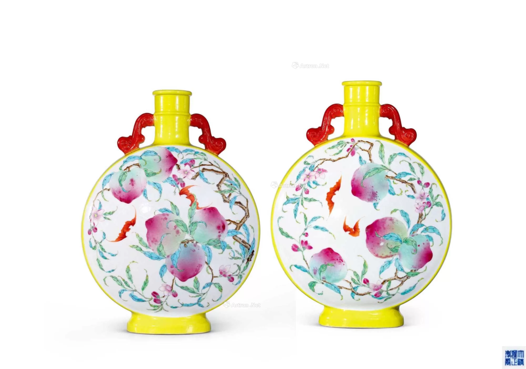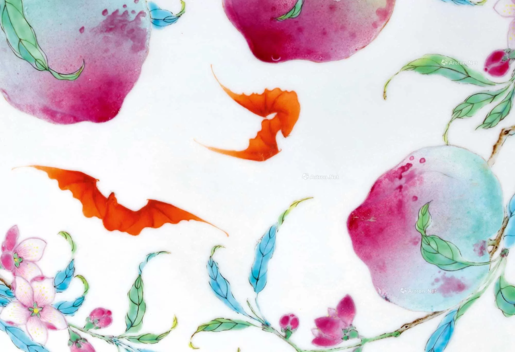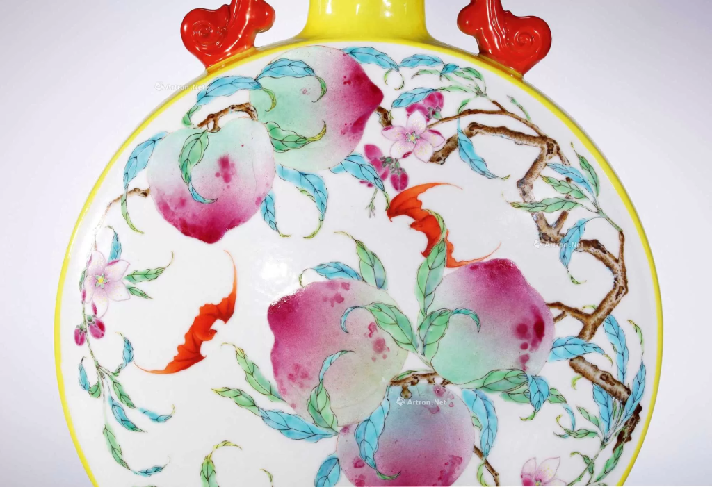 - 紋飾寓意:瓶身前後開光白地彩繪九桃福壽雙全圖,九桃分佈為前五後四,綴飾洋彩折枝蟠桃,蒼枝虬曲,翠葉陰陽反側,碩果粉嫩誘人,花蕊和花苞以細筆勾勒,點染施彩,富立體感。另見紅蝠雙雙,與蟠桃共構「福壽雙全」之寓意。