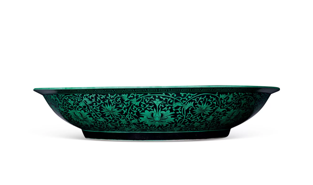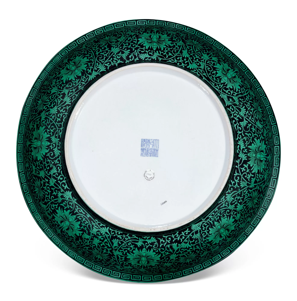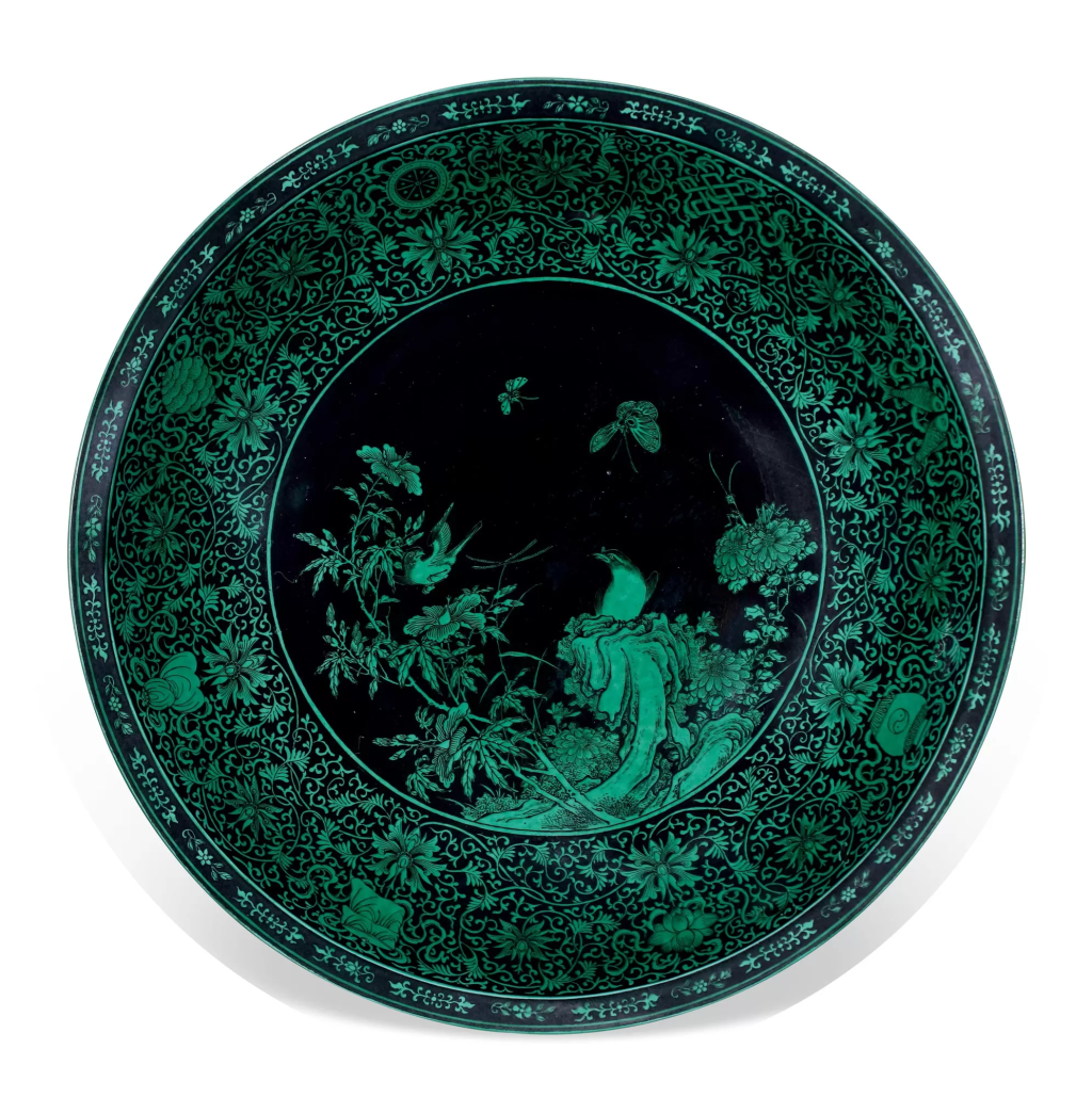 - 2021 年北京保利春拍:於 2021 年 6 月 7 日在北京保利春拍中亮相,作為十面觀止 — 十面靈璧山居諸家藏元明清珍瓷專場的封面拍品,該盤從 1300 萬起拍,2500 萬元落槌,加佣金後總成交價為 2875 萬元,成為當時拍賣市場上最貴的墨地綠彩大盤。