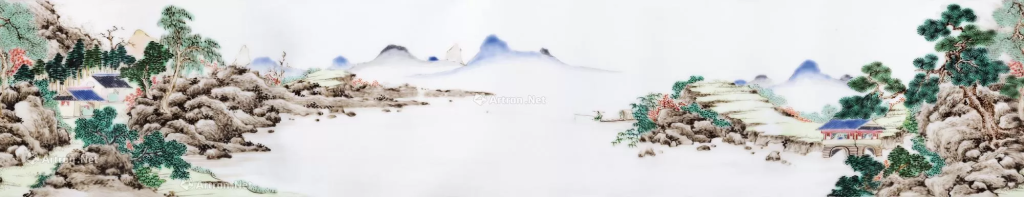 - 工藝特點:胎體緻密,圖案在器物上環繞一周,展開則是一幅完整的山水畫卷。構圖有密有疏,水面的遼闊與林石的繁密形成巧妙對比。山石的皴筆層次清晰,樹木依種類不同或用點簇或用夾葉。彩墨結合,以墨筆為骨幹,以青綠為主調,間雜些許鮮紅,色彩鮮亮明快。整體畫風富有清代宮廷山水畫嚴謹富麗、文雅含蓄的特點。