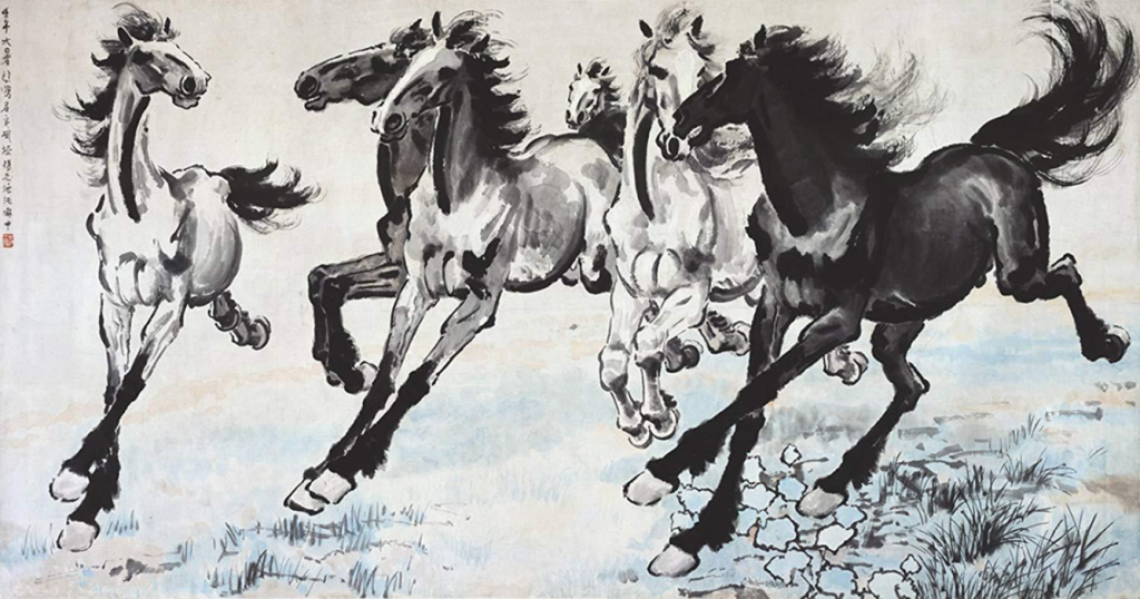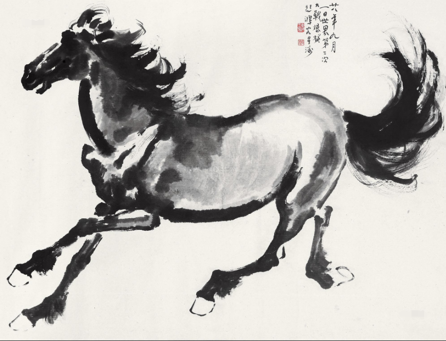 - 1939 年作《奔馬圖》:創作於 1939 年 9 月 1 日,繪於新加坡,當時徐悲鴻 40 歲。畫面中的駿馬氣宇軒昂,奔馳向前。徐悲鴻運用飽酣奔放的墨色勾勒頭、頸、胸、腿等部位,並以乾筆掃出鬃尾,使濃淡乾濕的變化渾然天成,充分體現了馬馳騁萬里、傲氣沖天的精神氣概。此作是在第二次世界大戰爆發,中國對抗日本法西斯的背景下創作的,表達了徐悲鴻的憂急之情以及對中華民族覺醒奮起的期望。