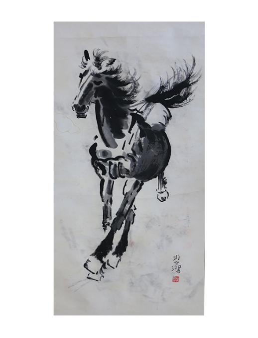 - 1941 年作《奔馬圖》:繪於 1941 年秋天,當時徐悲鴻為給抗戰募捐遠赴馬來西亞,國內抗日戰爭正處於戰略相持階段,二次長沙會戰中我方一度失利,徐悲鴻心急如焚,於是創作了這幅畫。該畫高 3.26 米、寬 1.12 米,是徐悲鴻平生所繪最大的《奔馬圖》真跡,2006 年被列入國家一級文物。畫面中駿馬由遠而近飛奔而來,採用大角度透視手法,以騰空的後腿和交叉的前腿展現奔跑速度,運用豪放的潑墨和勁秀的線描寫意方法,著重刻畫出馬的神韻和氣質。