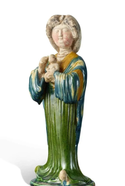 - 唐三彩蓝釉抱子仕女立俑:在苏富比香港 2025 春拍中,以 177.8 万港元成交,高 39.8 厘米。