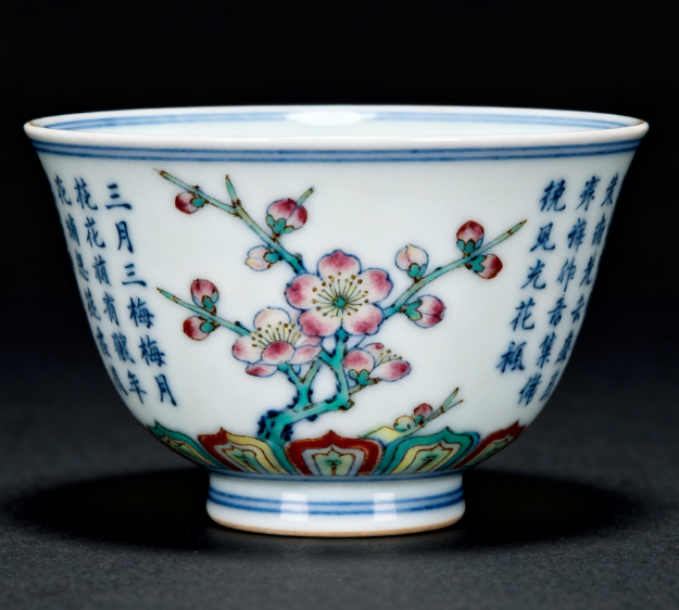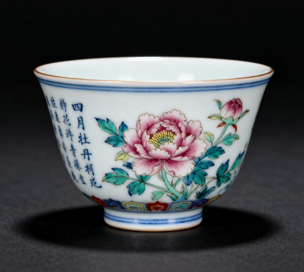 - 工藝特點:杯體胎質細膩輕薄,迎光可透。造型為撇口、深腹、淺圈足,線條流暢。裝飾上,鬥彩與五彩融合,釉下青花勾勒輪廓,釉上五彩填色,花卉描繪精細,花瓣紋理、花蕊形態栩栩如生。