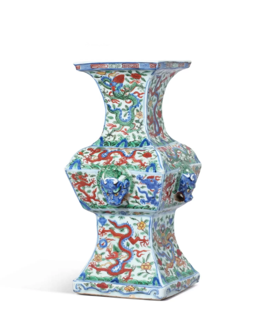 - 明萬曆五彩穿花龍紋鋪首大方尊:曾在紐約蘇富比拍賣,以 38 萬美元成交。
