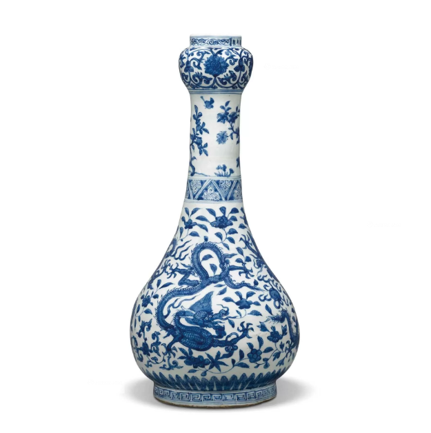 - 明萬曆青花穿花龍紋大蒜頭瓶在澳門多祿溙拍賣會中,以 HKD8,612,500 成交。