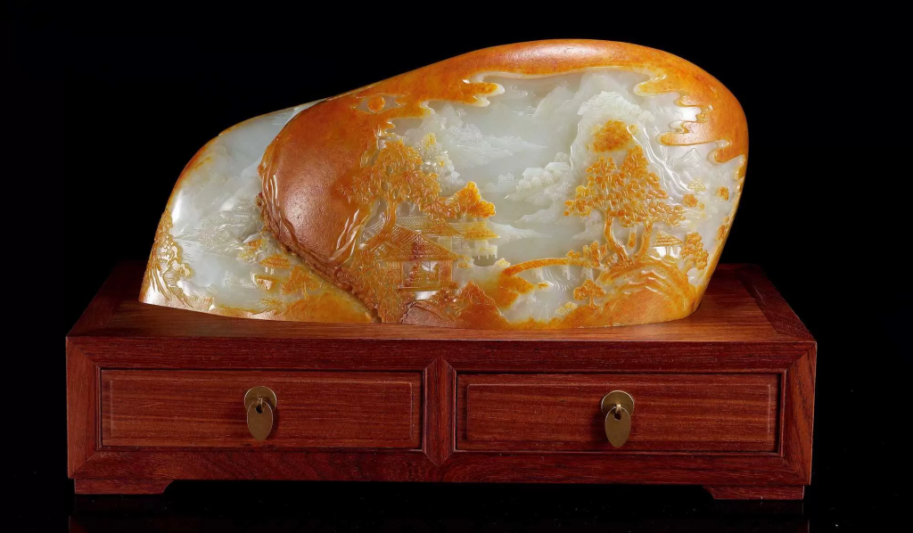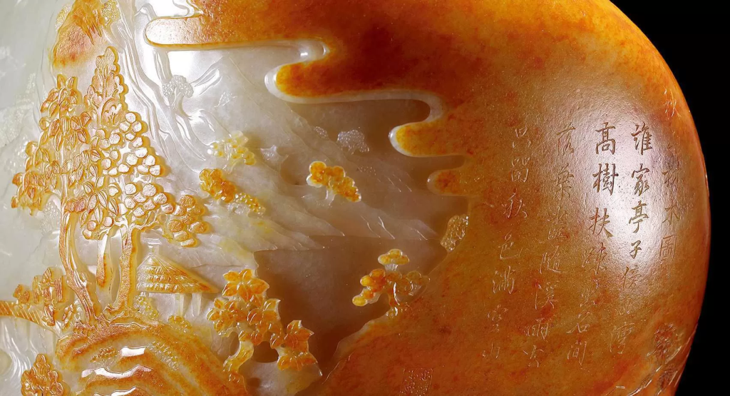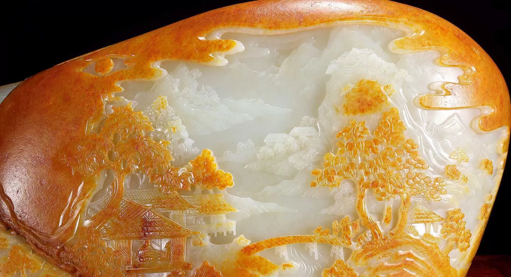 - 雕刻工藝:創作者以皮色為「天然墨色」,在玉料上精心鋪陳江山圖景。山巔巧留紅皮並漸變雕琢,松枝探向「月空」,皮色由紅轉金;山腰紅皮化作流雲,松柏以浮雕技法挺立,層次錯落有致;山腳紅皮漸褪為白玉本色,庭院、小橋、流水隱現,留白處盡是文人逸趣。此外,玉燈罩的「掏膛」技法更是精湛,整塊籽料被掏空成燈罩,內膛薄如蟬翼,既保證透光性,又维系了玉料的堅韌。