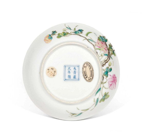 - 2024年香港佳士得拍賣會上:清雍正 粉彩过枝福壽仙桃紋盘成交價:448 萬港元。