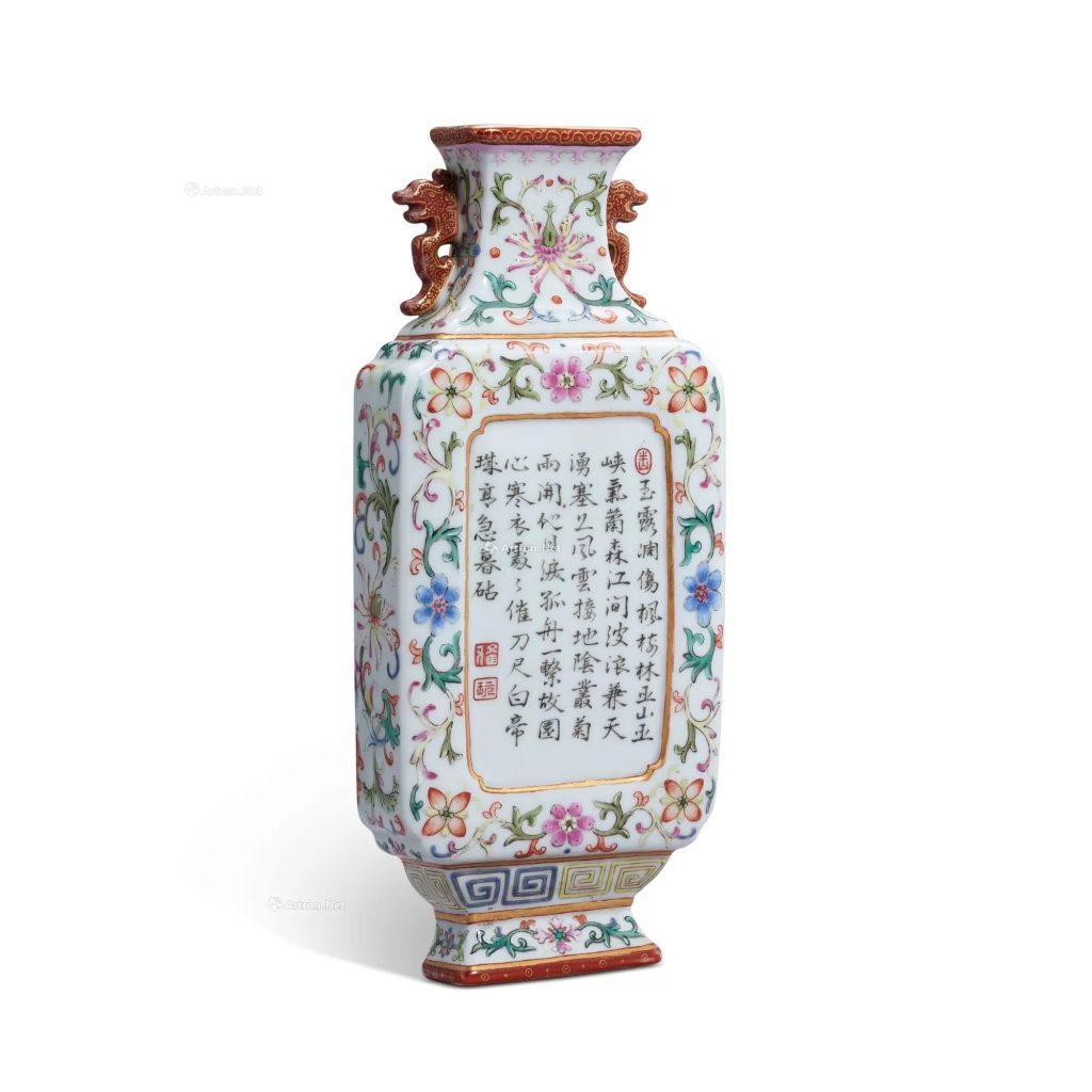 - 清乾隆綠地洋彩御製詩文壁瓶:在澳门多禄溙 2024 年秋拍中,以 387,500 元成交。
